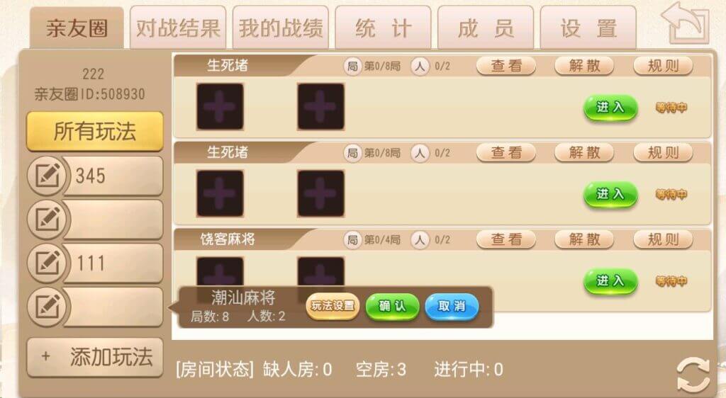 商业运营平台,创胜系列新饶客自家人人麻将(潮汕麻将),房卡带亲友圈。