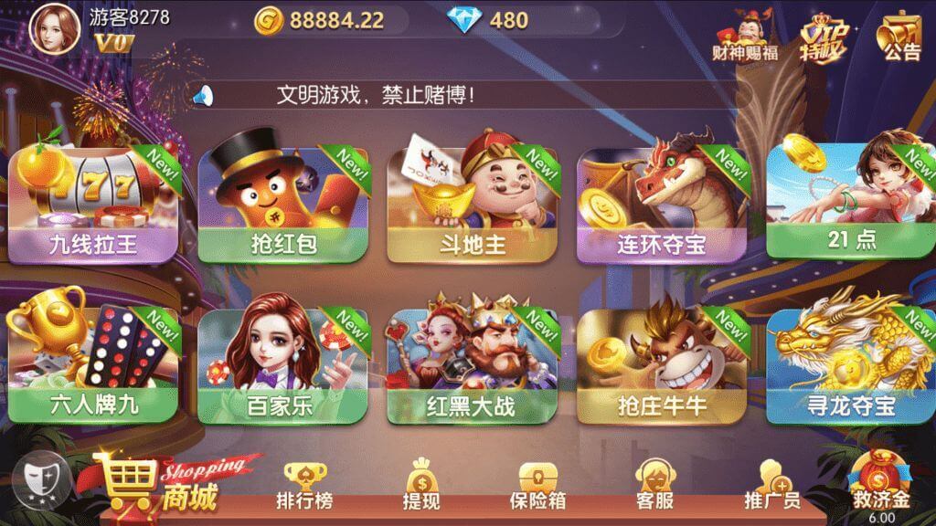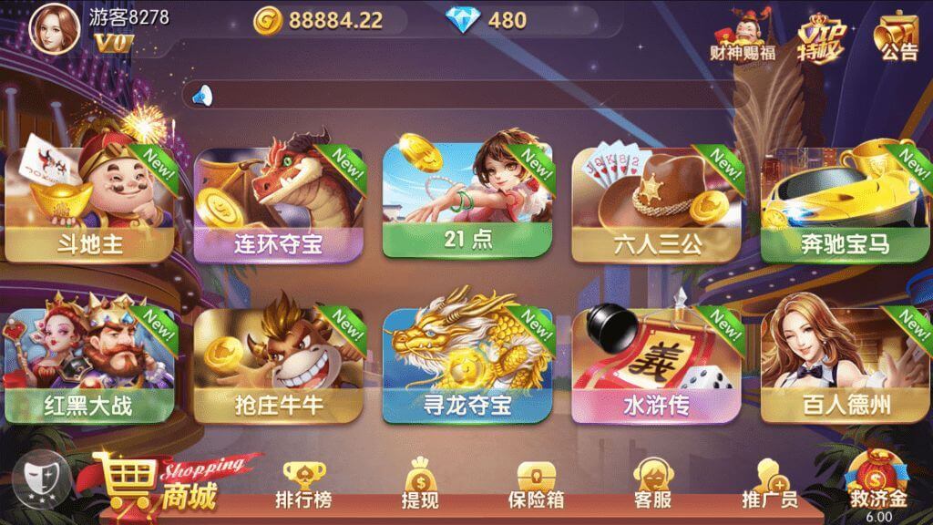 跑的快,斗地主,龙虎,推筒子,二人麻将,骰宝,飞禽走兽,血战麻将,红包扫雷,五星宏辉,德州扑克,连环夺宝,九线拉王,ATT连环炮,红黑,六人牌九,六人三公,大闹天宫,寻龙夺宝,奔驰宝马,港式五张,水浒站,21点等29款游戏。