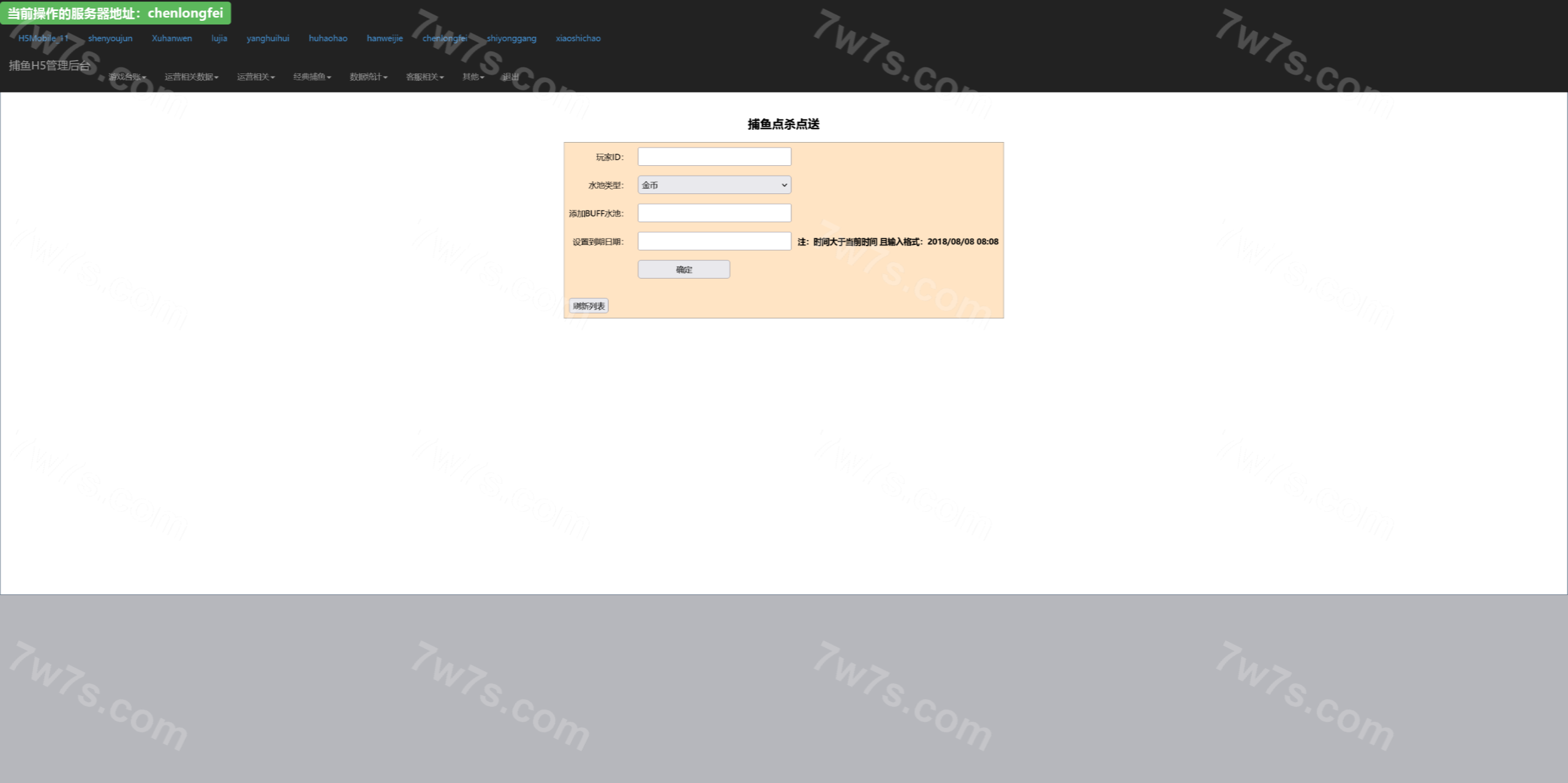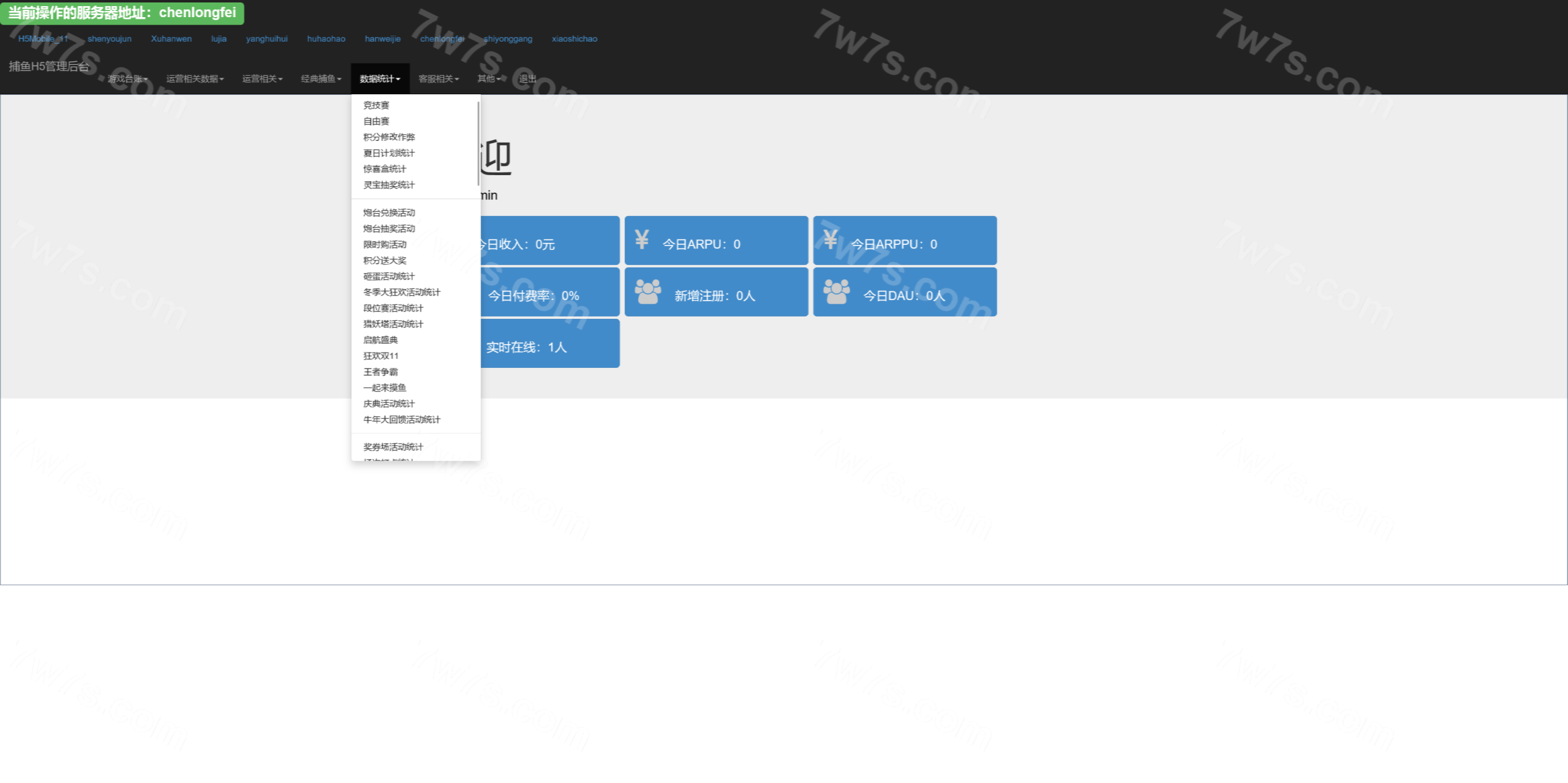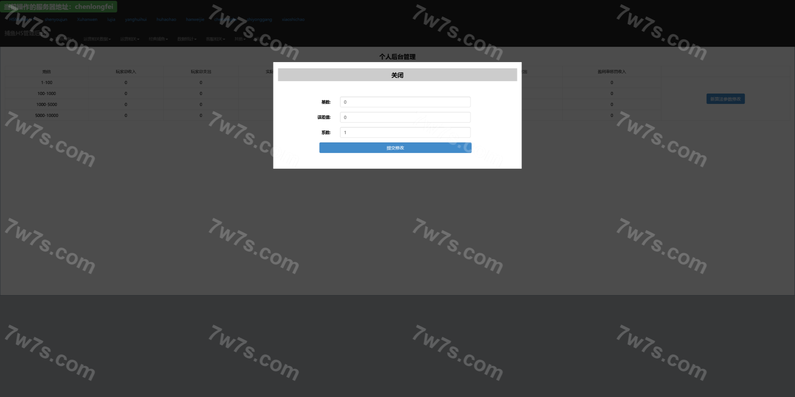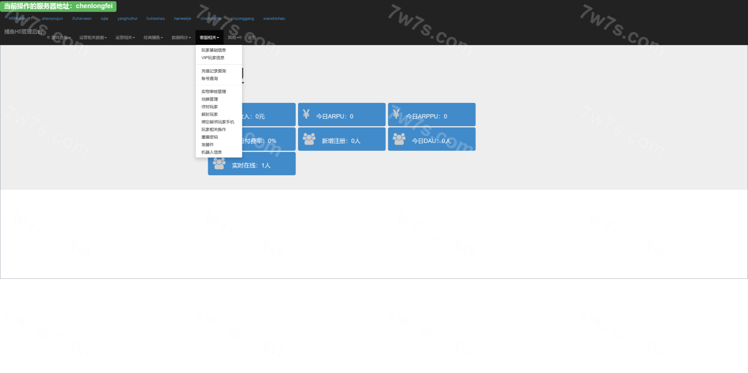 总管理后台可以针对每个渠道进行管理,网站源码中kufu是给渠道商的管理系统,控制系统分为全局参数控制、及账号点杀点送。其他的功能看上面的管理后台运行截图吧。