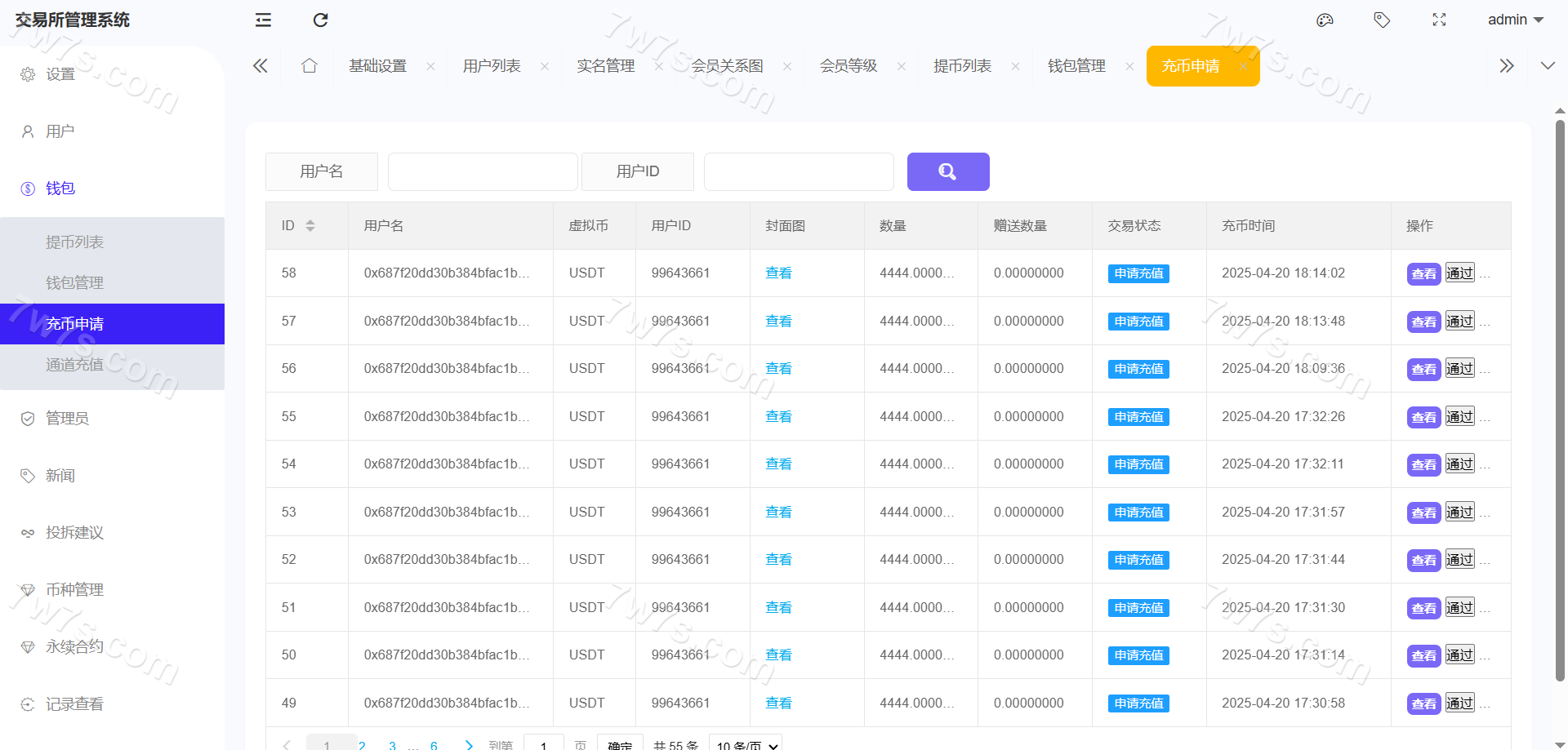 存款功能支持 USDT 存款,提供 ERC20 和 TRC20 两种链类型的选择,生成对应的存款二维码和钱包地址,方便用户进行资金充值。
